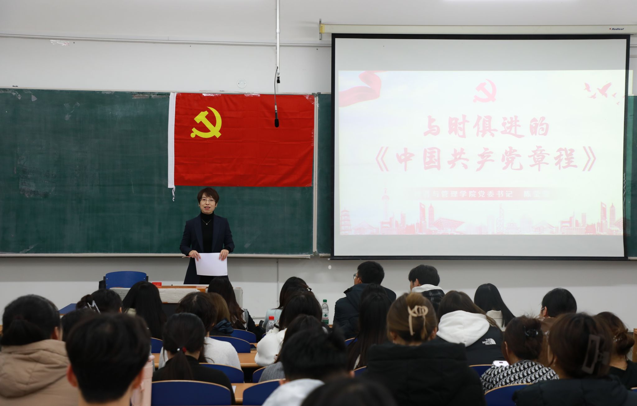 为深入贯彻落实学校党委关于党员发展对象培训的相关要求,进一步加强党员发展对象党性与理想信念教育,经济与管理学院于11月3日18:00在崇师楼D403组织开展2025年下半年党员发展对象培训集中授课。本次培训由学院党委书记陈莹莹主讲,主题为《与时俱进的中国共产党章程》与深入贯彻中央八项规定精神学习教育,全体2025年下半年党员发展对象参加学习。