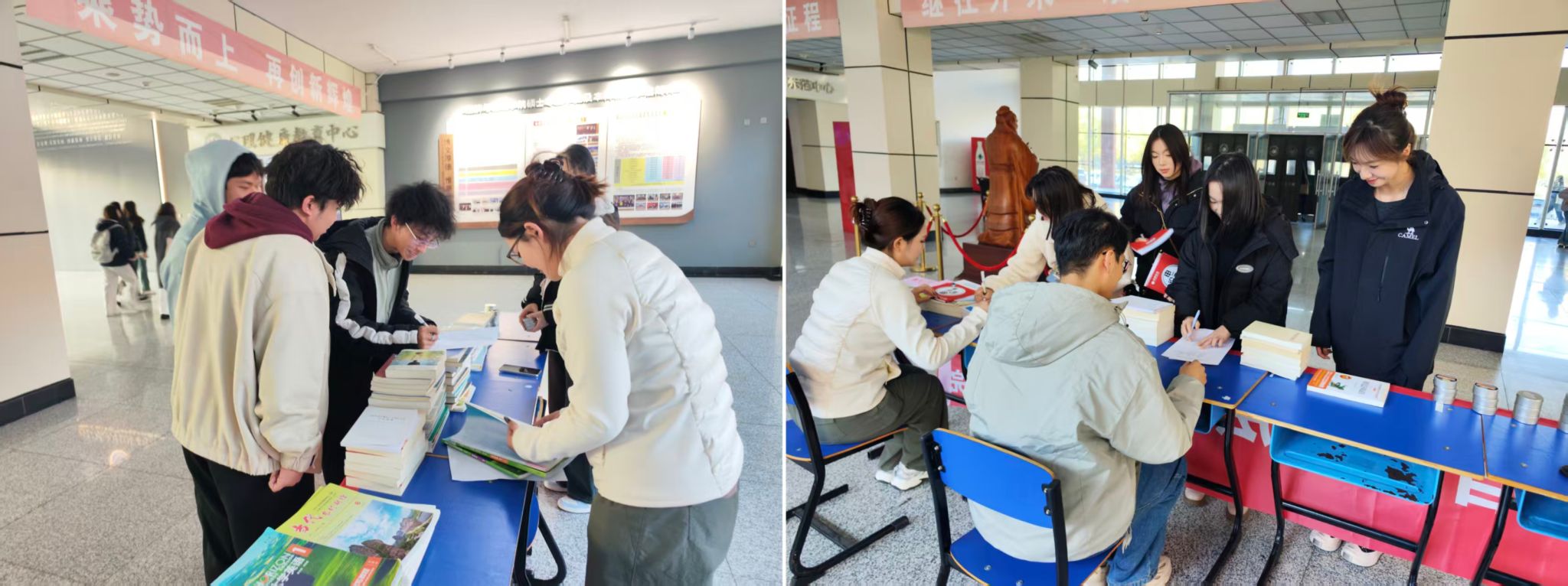 活动当日,党员志愿者提前抵达现场,精心划分并布置捐书区、登记区与书籍整理区,从指引标识到纪念礼物,每一处细节都彰显着暖心考量。活动正式启动后,全院学子踊跃参与,纷纷携带着精心挑选的图书奔赴现场——既有实用易懂的生活百科,能切实解决日常所需;更有启迪智慧的科普读物与农业技术工具书,全方位满足不同群体的阅读需求。志愿者始终面带微笑,耐心为每一位捐书学子办理登记手续,细致讲解活动意义,并递上纪念礼品。现场分工明确、配合默契,往来穿梭的身影、整齐堆放的书籍、温暖真挚的交流,构成了一幅“书香传爱心,青春赴使命”的动人画卷。