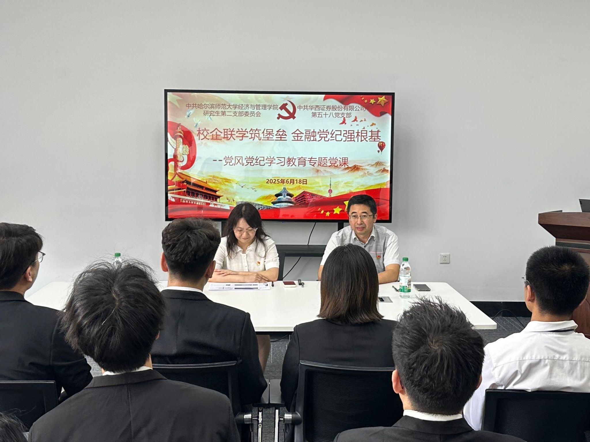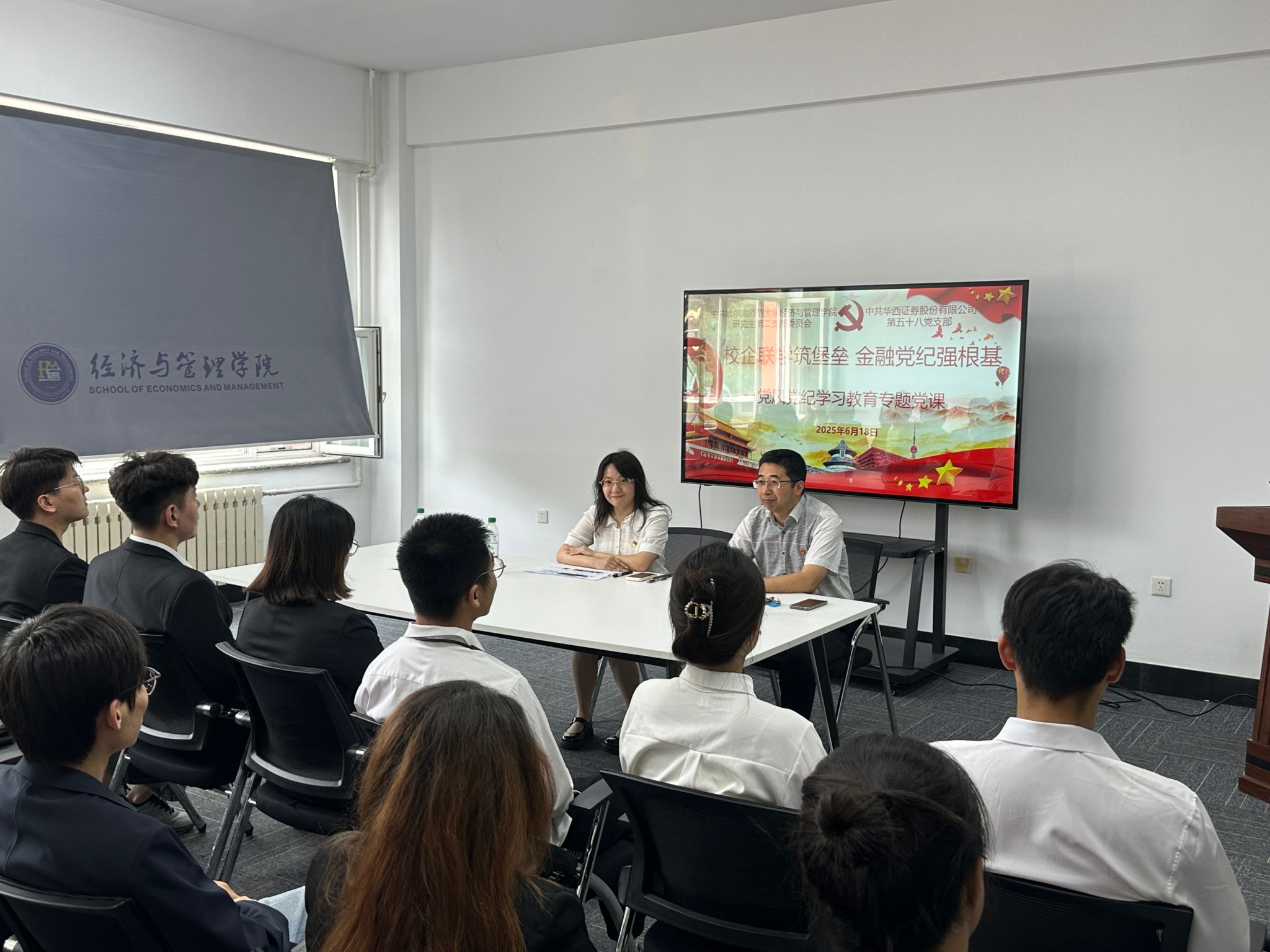 为深入贯彻新时代党的建设总要求,充分发挥高校基层党组织思想引领作用,推动高校与企业党组织深度合作,6月18日,经济与管理学院研究生第二党支部与华西证券哈尔滨第五十八党支部携手开展“校企联学筑堡垒,金融党纪强根基”党风党纪专题党课学习活动。此次活动由经济与管理学院副处级辅导员赵东威担任主讲,华西证券哈尔滨第五十八党支部书记邱波及双方支部党员共同参加了活动。