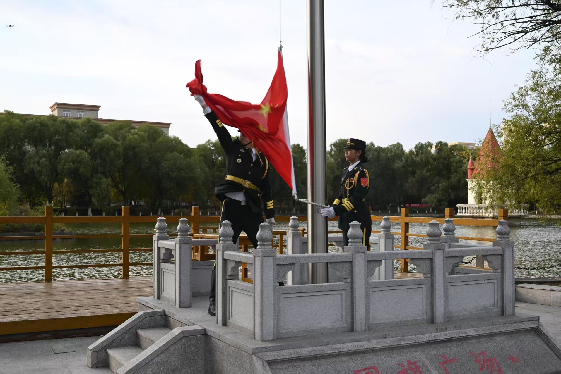 晨光初启,万物肃然。上午7时整,升旗仪式在庄严的气氛中正式开始,英姿飒爽的国旗护卫队迈着铿锵有力的步伐,护送五星红旗走向升旗台,伴随着雄壮的《义勇军进行曲》,鲜艳的五星红旗冉冉升起,全体师生齐声高唱国歌,向国旗行注目礼,表达对祖国的无限热爱与崇高敬意。