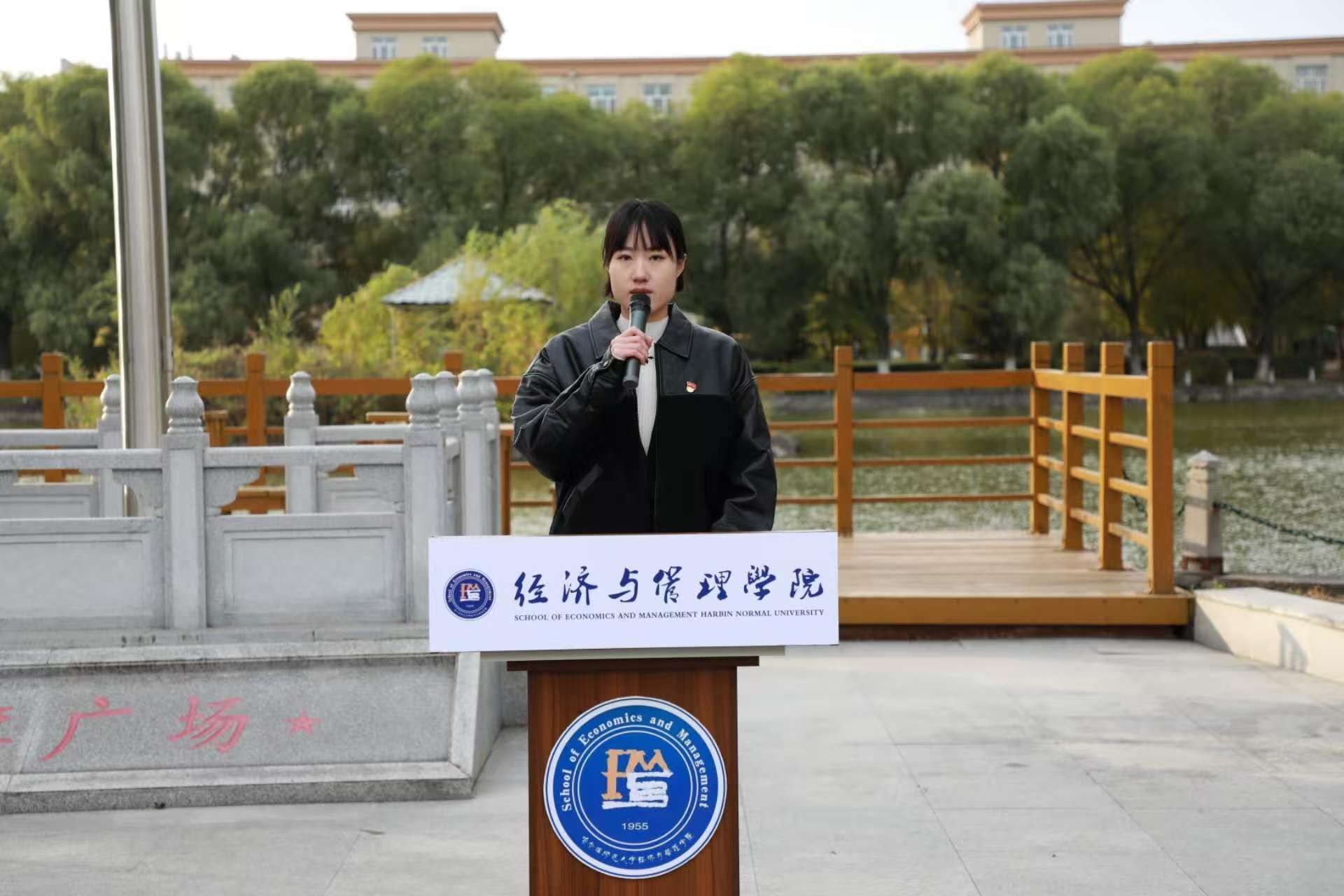 升旗礼毕,学院优秀学生党员代表房馨媛在国旗下发言。她回顾了抗美援朝战争中革命先辈的英雄事迹,号召全体同学铭记历史、珍惜和平,继承先烈遗志,将个人理想融入国家发展,以真才实学服务人民,以青春奋斗奉献国家