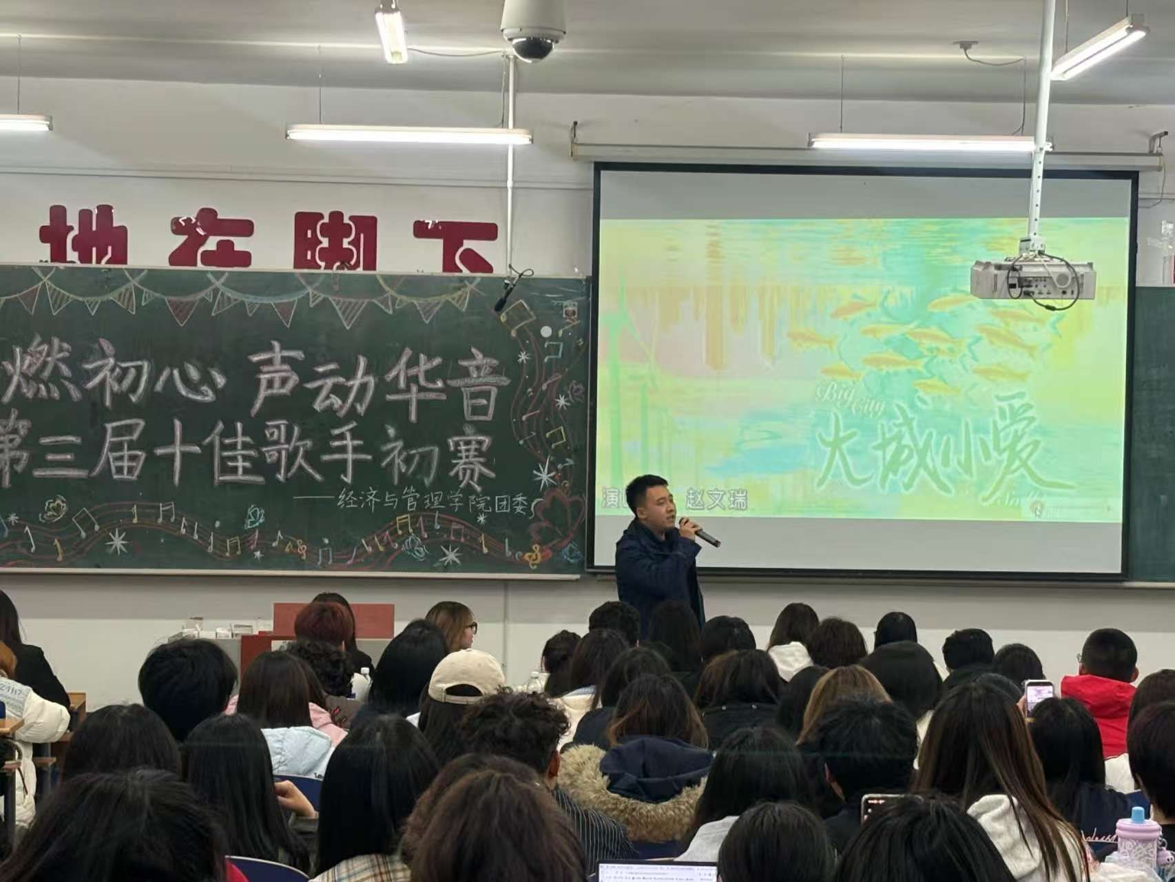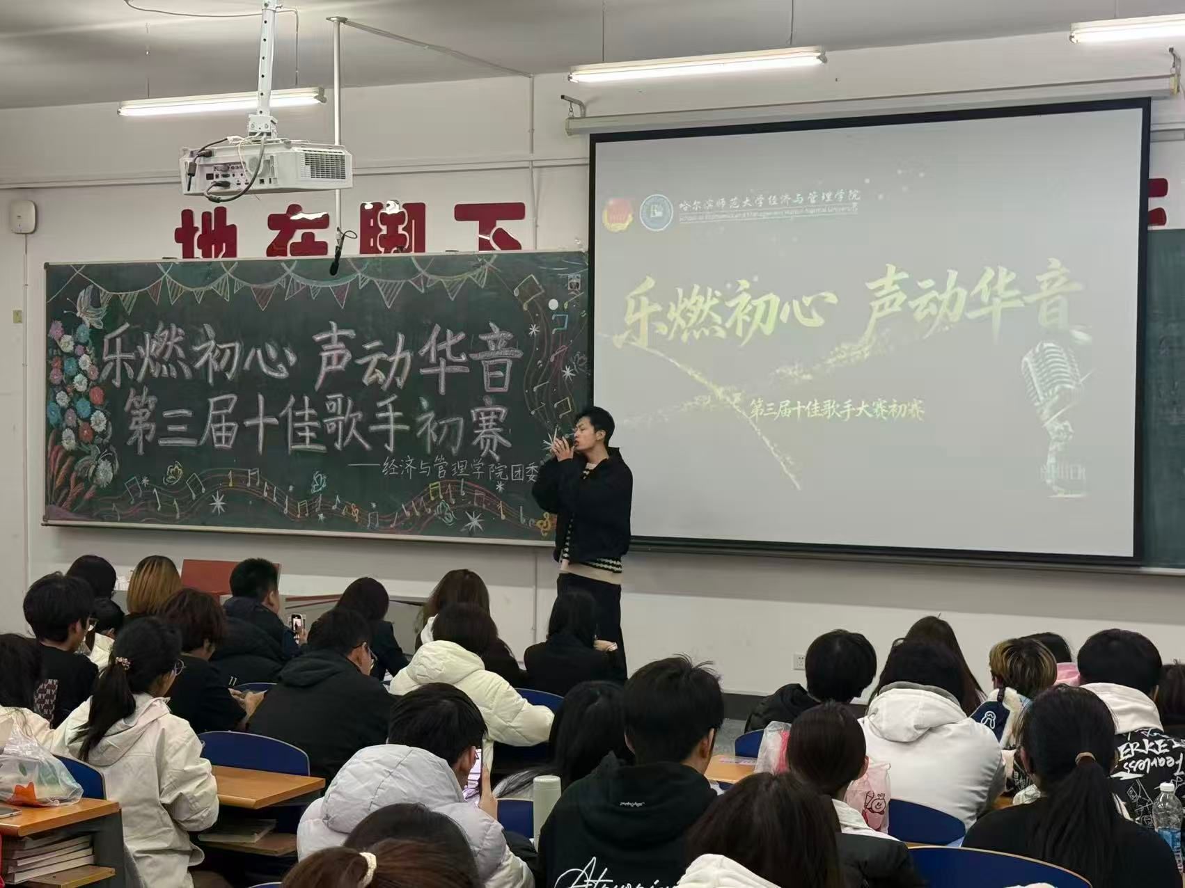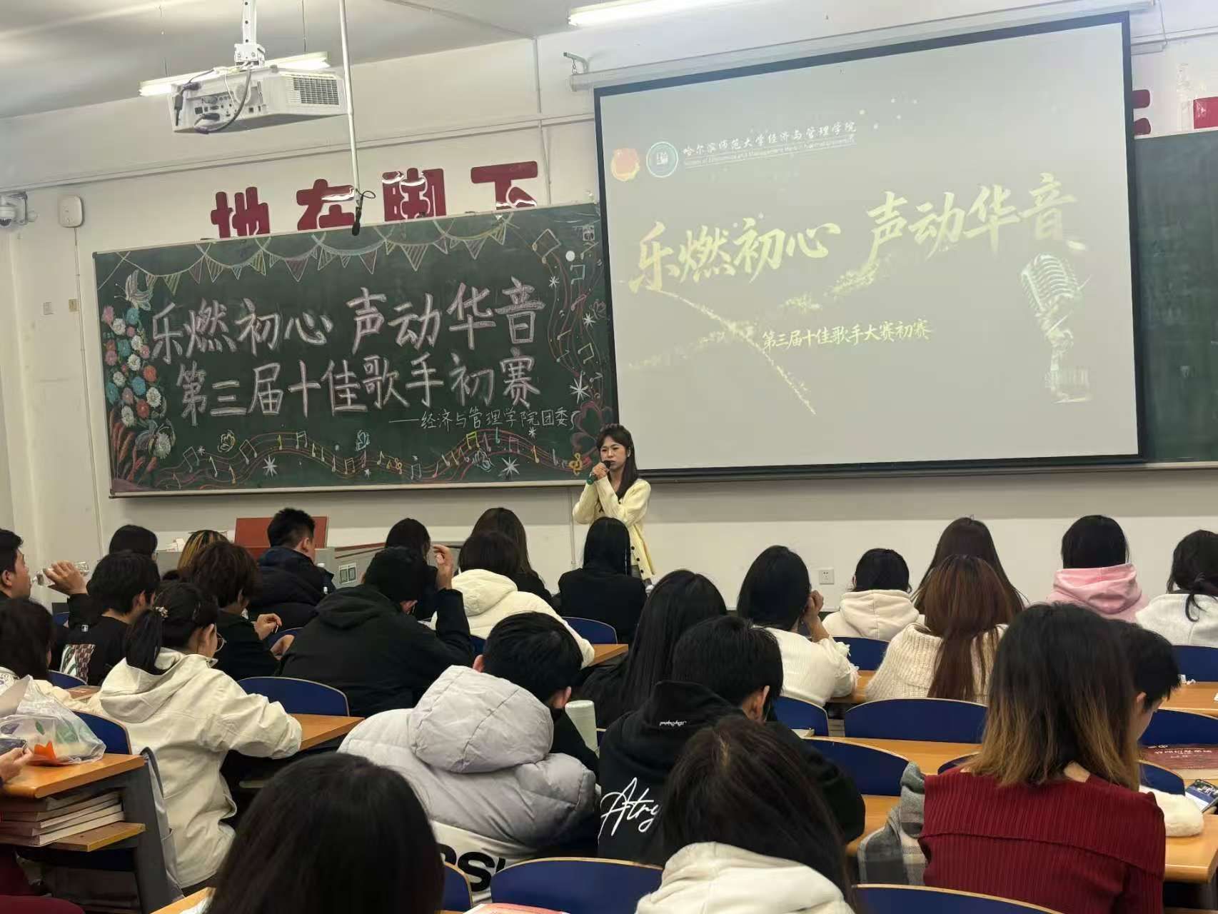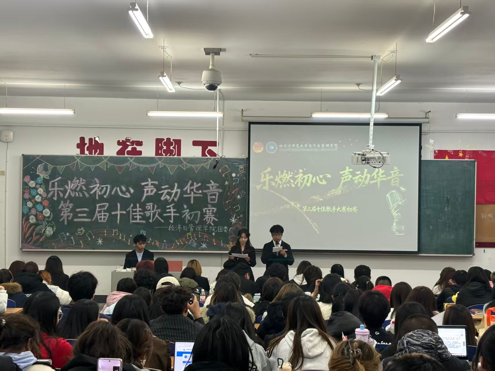为深耕校园文化沃土,丰富师生课余生活,凝聚青年奋进力量,经济与管理学院于11月6日在崇师楼D205举办第三届“乐燃初心,声动华音”十佳歌手大赛初赛。赛前学院利用各种平台广泛宣传动员,为全体同学搭建展示自我的舞台,共吸引52名学生踊跃报名,尽显学院浓厚文艺氛围与学子昂扬青春活力。本次初赛由学院第二届十佳歌手大赛冠军陈宏博、亚军吕晓盈、季军赵文瑞担任评委。
