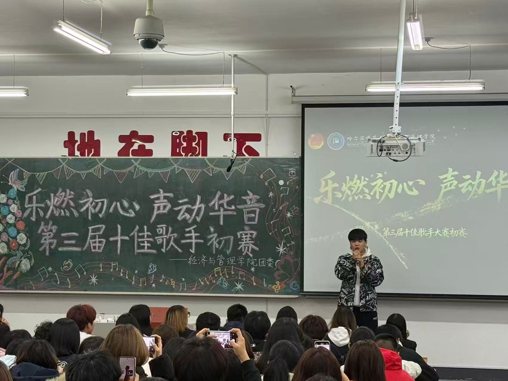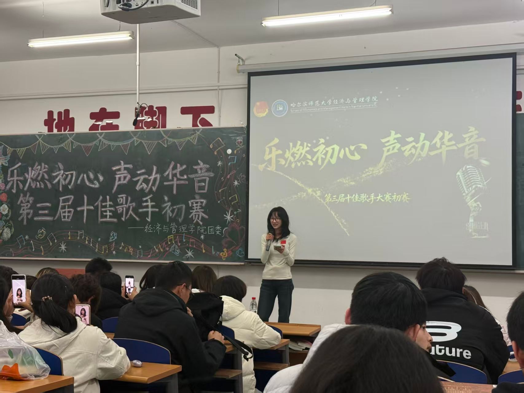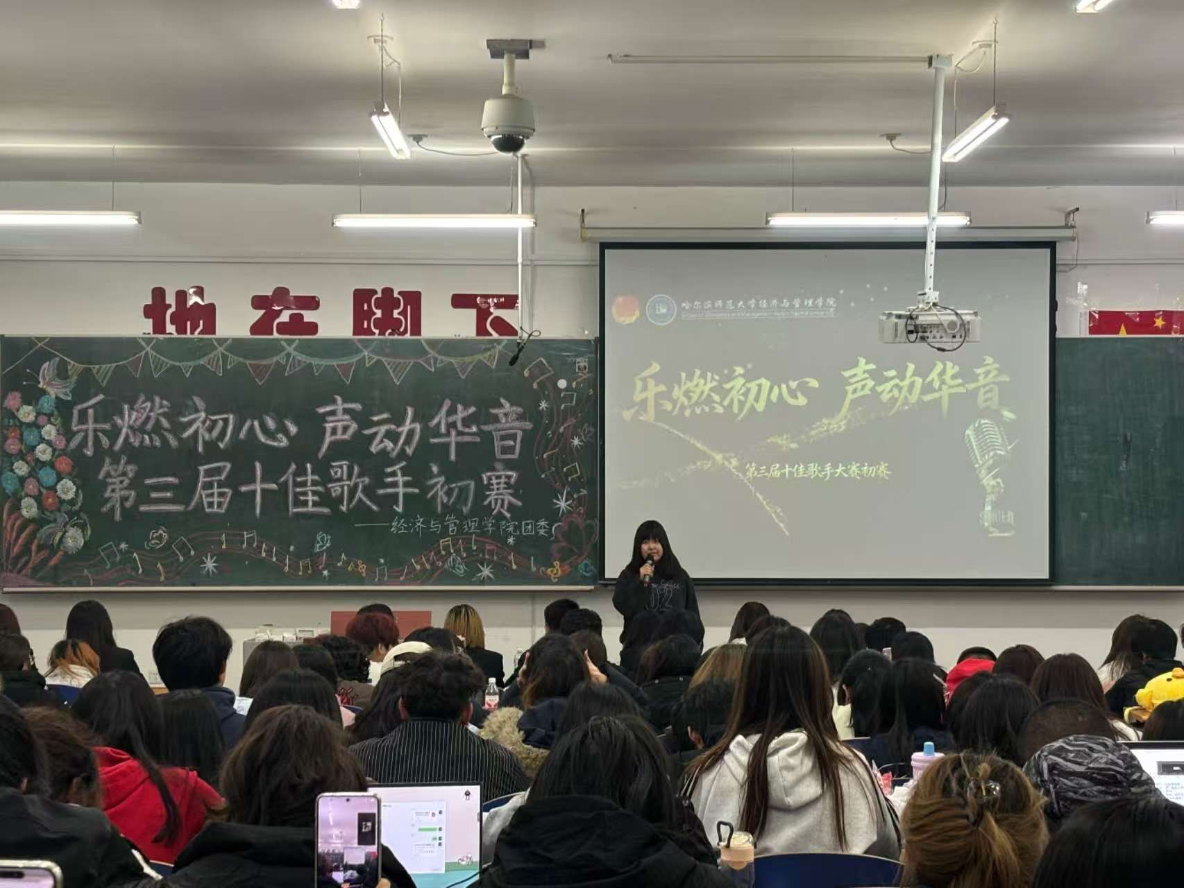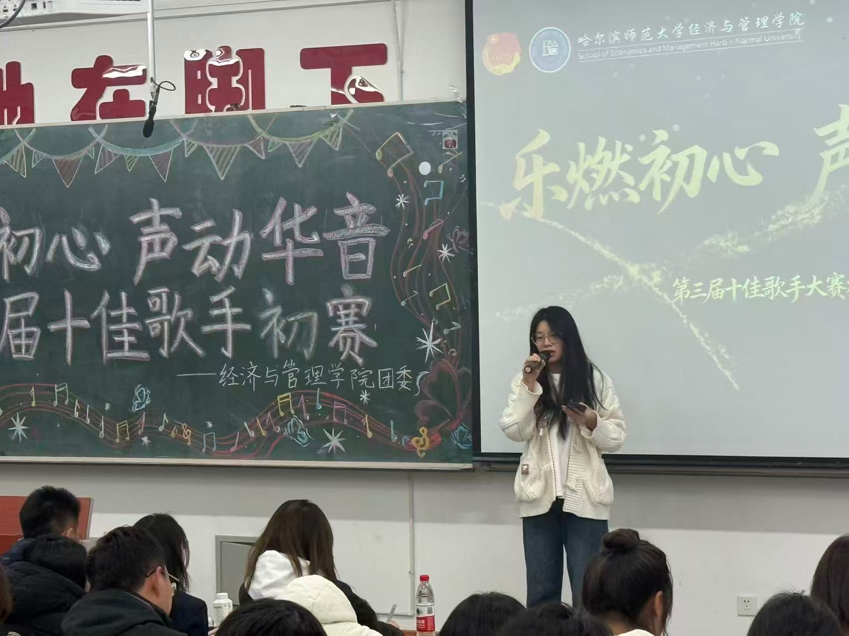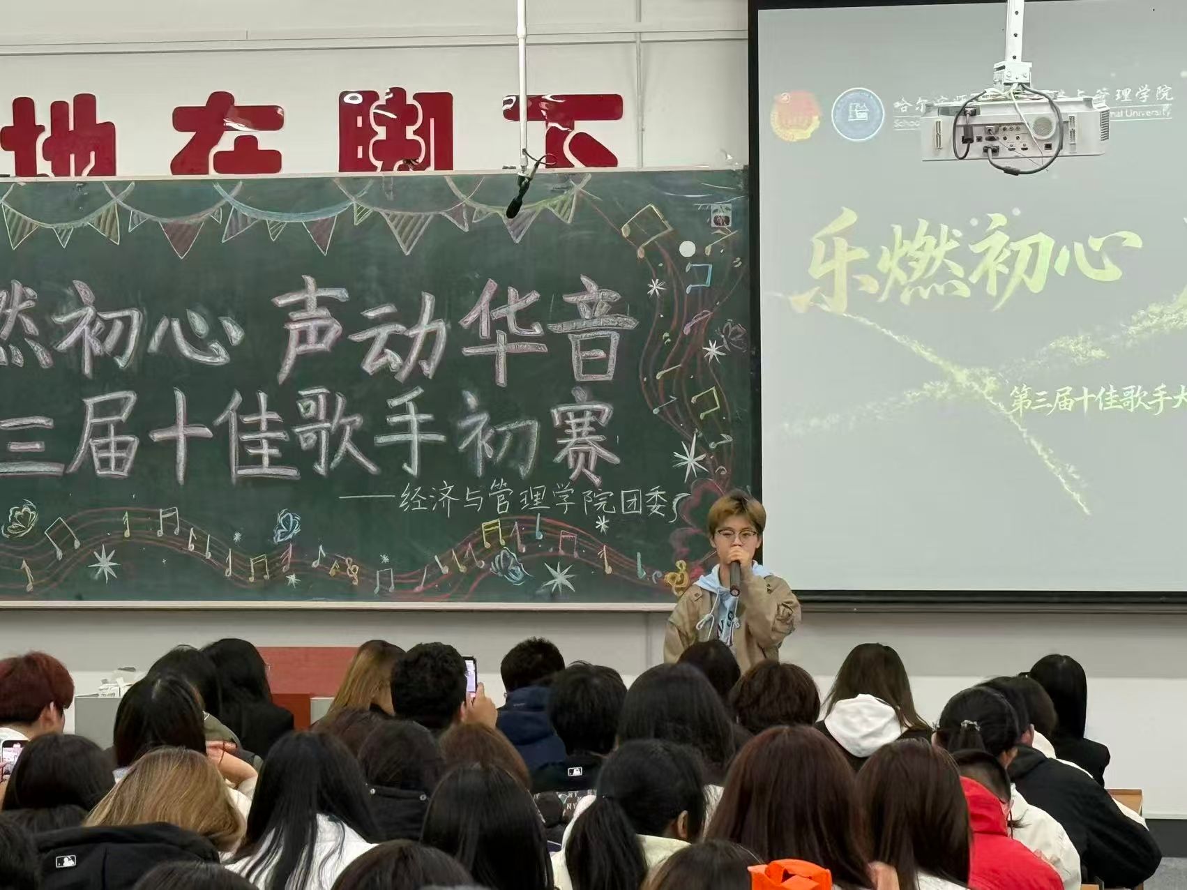 为深耕校园文化沃土,丰富师生课余生活,凝聚青年奋进力量,经济与管理学院于11月6日在崇师楼D205举办第三届“乐燃初心,声动华音”十佳歌手大赛初赛。赛前学院利用各种平台广泛宣传动员,为全体同学搭建展示自我的舞台,共吸引52名学生踊跃报名,尽显学院浓厚文艺氛围与学子昂扬青春活力。本次初赛由学院第二届十佳歌手大赛冠军陈宏博、亚军吕晓盈、季军赵文瑞担任评委。