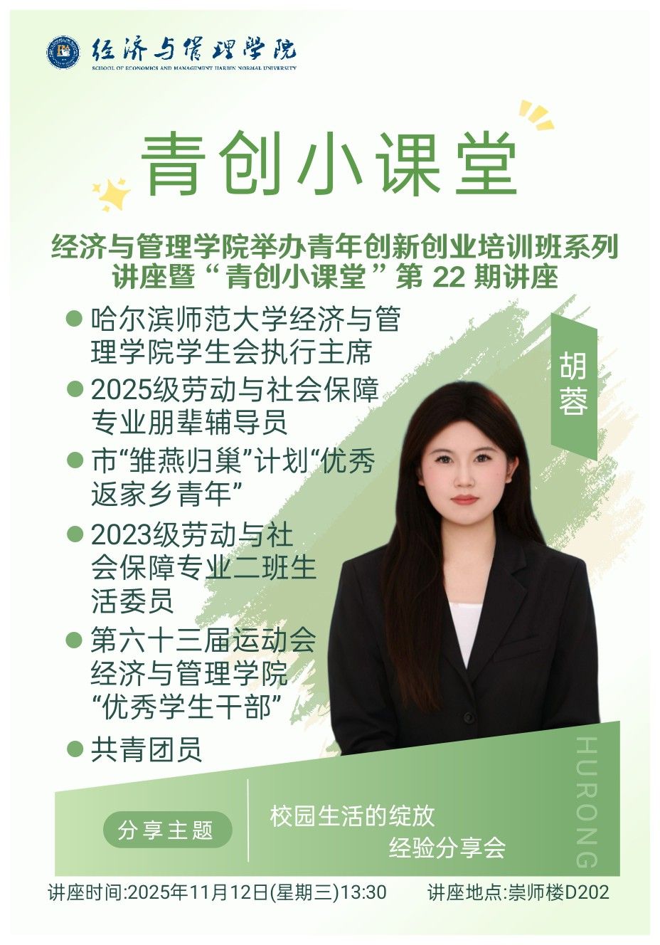 经济与管理学院创新创业协会于2025年11月12日在崇师楼D202举办“青创小课堂”第二十二期讲座。本次邀请的主讲人是哈尔滨师范大学经济与管理学院学生会执行主席胡蓉,为大家带来校园生活的绽放分享会专题讲座。有关事宜如下:
