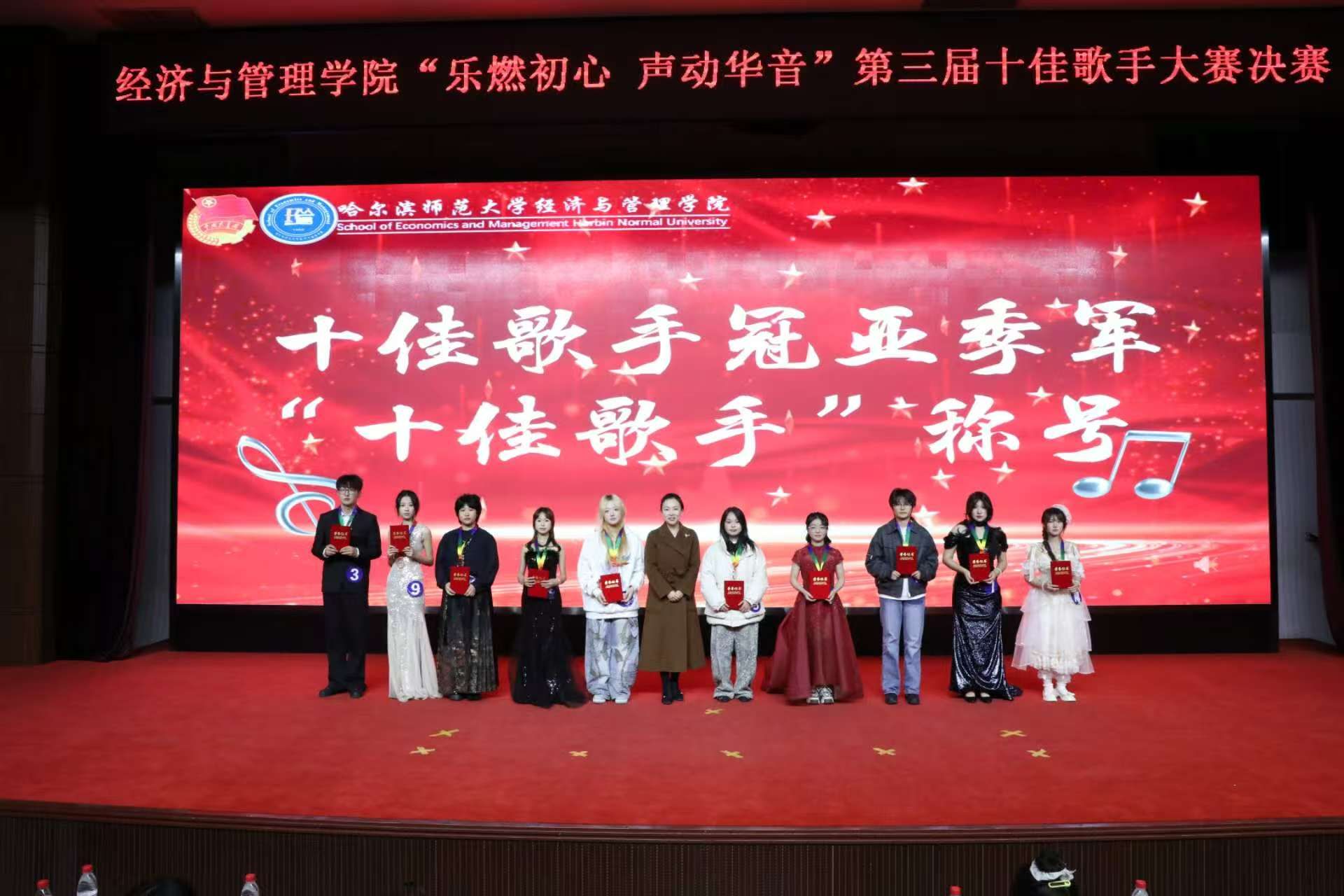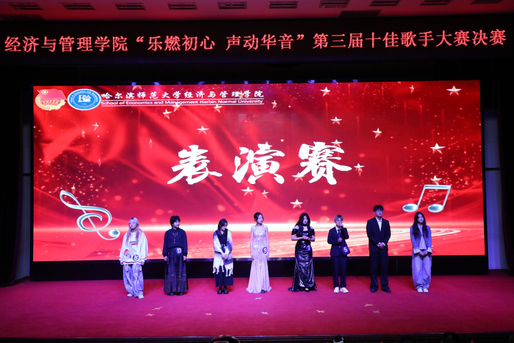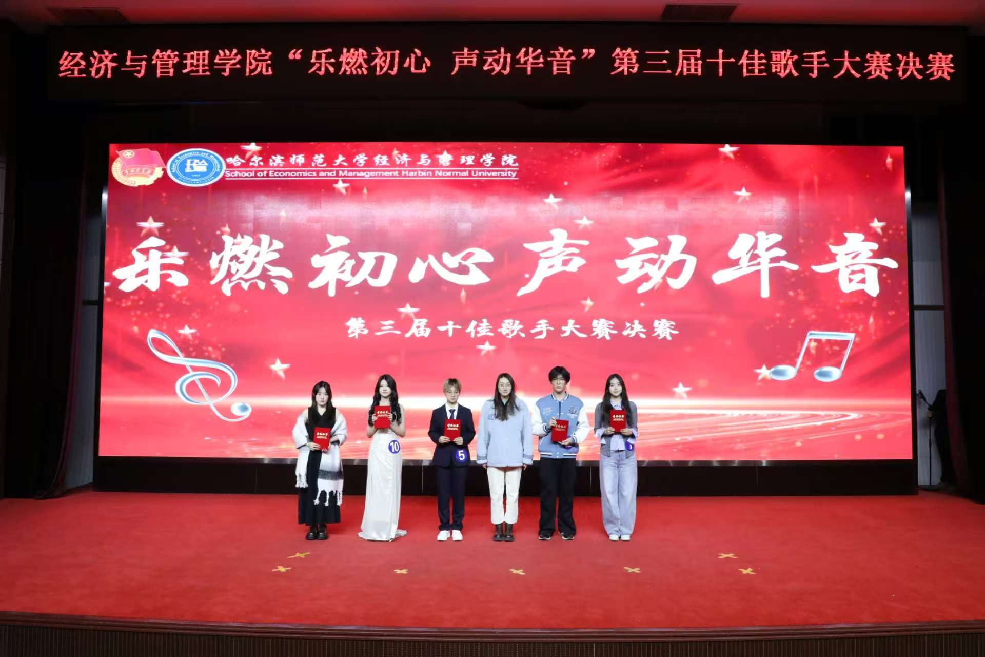 为进一步丰富校园文化活动,营造积极向上的学院风气,彰显经管学子的青春风采与奋进姿态,经济与管理学院团委于2025年11月18日18:00在科学会堂举办“乐燃初心,声动华音”经济与管理学院第三届十佳歌手大赛决赛。出席本次决赛的嘉宾有经济与管理学院团委书记陈凤和辅导员代表龚泳霖老师、姬晨毓老师、李金蔚老师、佟瑶老师。担任本次决赛的评委有经济与贸易系教研室主任王星元老师,2022级本科生辅导员、艺术学硕士金东旭老师,哈尔滨师范大学第三十五届校园十佳歌手葛珩宇,哈尔滨师范大学第三十六届校园十佳歌手贾雨航、经济与管理学院第二届十佳歌手大赛冠军陈宏博。