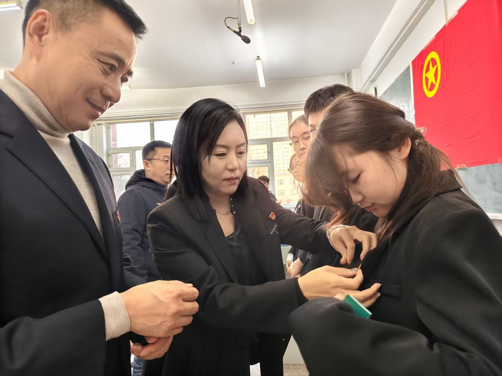 仪式第三项,各辅导员老师依次为新发展团员颁发团员证、团章并佩戴团徽。团徽象征着荣誉与责任,激励新团员坚守理想信念、勇担青春责任,以坚定信念与实干担当书写青春答卷。