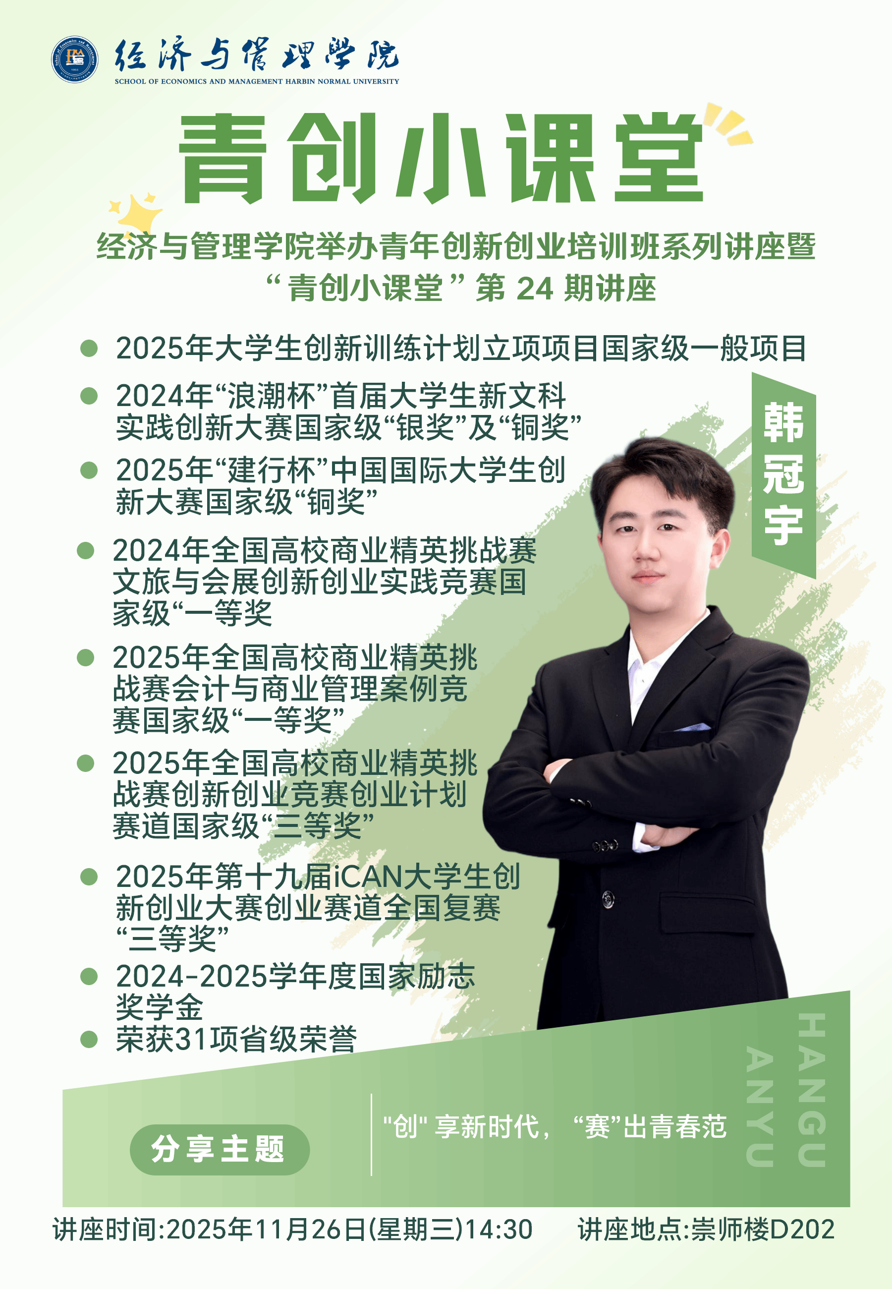 经济与管理学院创新创业协会于2025年11月26日在崇师楼D202举办“青创小课堂”第二十四期讲座。本次讲座邀请多次荣获国家级比赛荣誉的哈尔滨广厦学院学生韩冠宇作为主讲人,他为大家带来“‘创’享新时代,‘赛’出青春范”专题讲座。有关事宜如下: