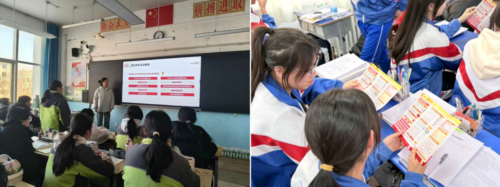 团队成员主要由学生党员和优秀学生干部组成,他们回到母校,通过分享自己在哈师大的成长经历,自然而然地引出国家安全的重要性。他们与学弟学妹们促膝长谈,讲述大学校园中的见闻以及国家发展与个人命运紧密相连的深刻感悟,以身作则,激发中学生对国家安全的初步认知和认同感。通过互动问答、短视频沉浸代入等方式,将看似严肃的国家安全知识融入轻松有趣的活动中,极大地调动了现场中学生的参与热情。同时,通过发放国家安全教育宣传手册,深入浅出地为中学生讲解政治安全、网络安全、生物安全等不同领域的具体内涵和现实案例,引导同学们认识到维护国家安全是每一位公民的义务和责任,帮助他们建立起较为清晰的国家安全知识框架。