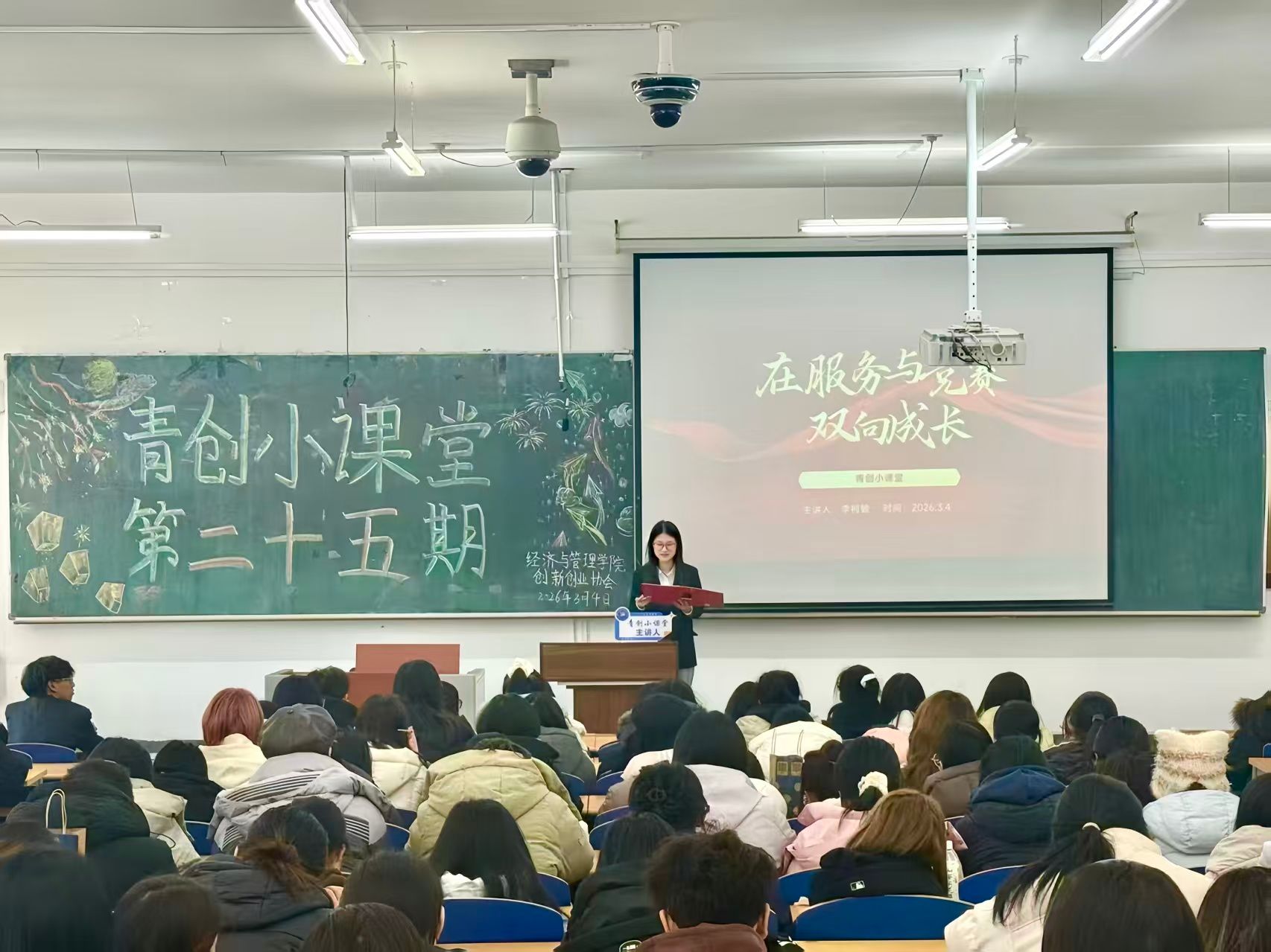 为扎实推进哈尔滨师范大学大学生志愿服务与竞赛成果教育工作,提升经济与管理学院学生的大赛实战能力,提高学生的大赛素养和综合素质,持续推动教学科研与学生实践创新能力的高效融合。经济与管理学院创新创业协会于2026年3月4日13:30在崇师楼D202举办“青创小课堂”第二十五期讲座。讲座邀请经济与管理学院2023级人力资源管理专业李柯敏同学主讲,200余名学生参加本次讲座。