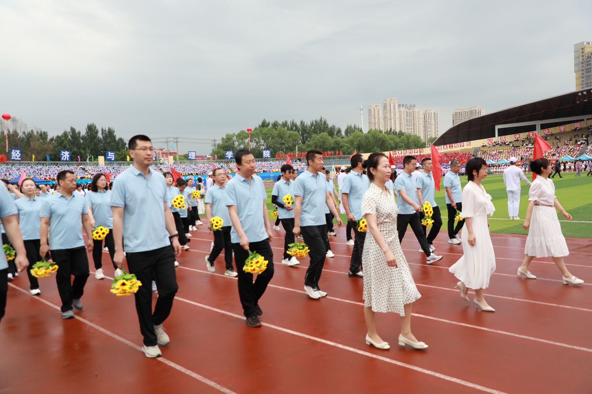 紧随其后的是教师方队,老师们面带微笑,整齐的步伐展现出他们严谨的治学态度和积极向上的精神风貌。他们是知识的传播者,也是体育精神的践行者。平日里,他们在讲台上辛勤耕耘,用智慧和汗水培育着莘莘学子。今天,他们在运动场上以身作则,与学生们一同挥洒汗水,展现出团结协作、积极进取的师者风采。