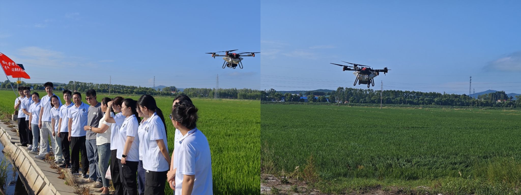 随后众人移步水田,技术人员手持遥控器,启动植保无人机,螺旋桨飞速旋转,激起层层稻浪。王君梅介绍说:“无人机采用厘米级定位,可自动规划航线,每亩用药误差不超过5%,作业效率是人工的20倍,彻底把乡亲们从‘背壶打药’的繁重劳作中解放了出来。”在试验田里,队员们俯身仔细察看水稻长势,围绕抗病品种选育、秸秆还田技术等关键问题接连发问,农技员们耐心细致地一一解答。在这一过程中,队员们对科技创新在提升农业生产效益、保障粮食安全方面的重要意义,有了更为直观、深刻的认识。