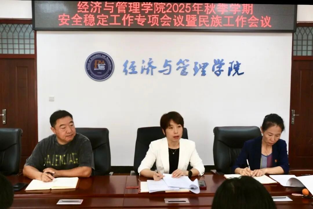 为深入贯彻落实学校安全稳定工作精神,统筹推进黑龙江省委教育工委关于开展民族团结进步宣传月系列活动,进一步加强校园安全管理,深化民族团结教育,经济与管理学院于9月8日15:00,在崇师楼A208召开2025年秋季学期安全稳定工作专项会议暨民族工作会议。会议由学院党委书记陈莹莹主持,学院党委委员、全体党支部书记和辅导员参加会议。