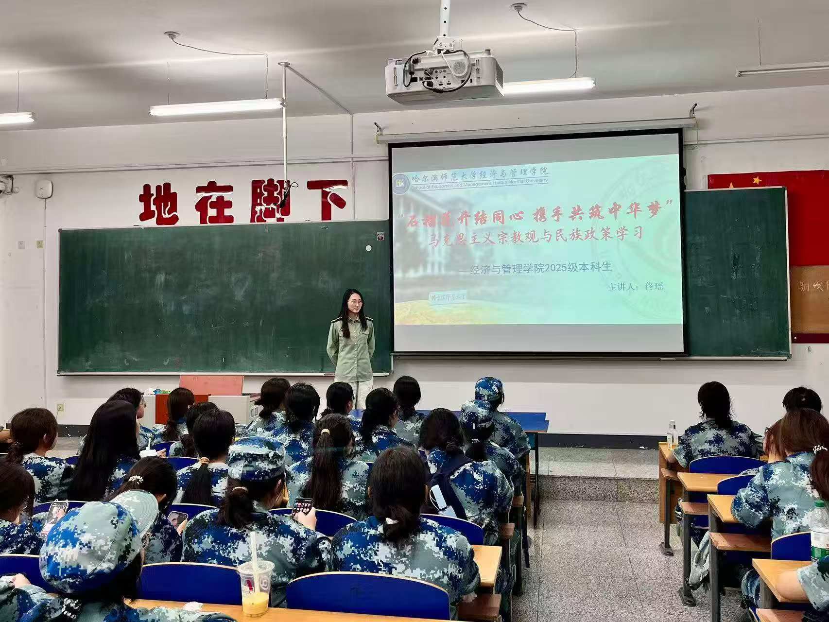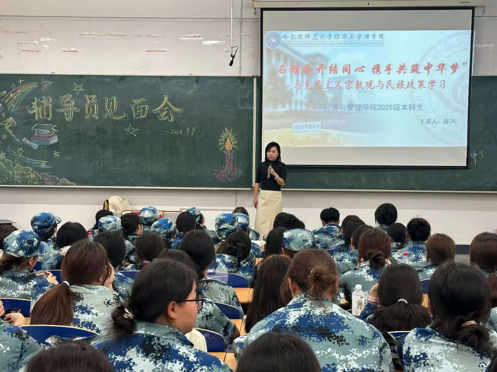 为深入学习贯彻《中国共产主义青年团章程》与《中华人民共和国宪法》中关于宗教和民族的相关规定,引导新生树立正确宗教观,铸牢中华民族共同体意识,按照我校“十个一”新生入学教育方案要求,9月11日经济与管理学院新生辅导员王秋伟老师、陈凤老师、佟瑶老师分别在崇师楼D502、D203、D202教室,面向全体2025级新生同步开展“宗教与民族认同”主题教育大会。