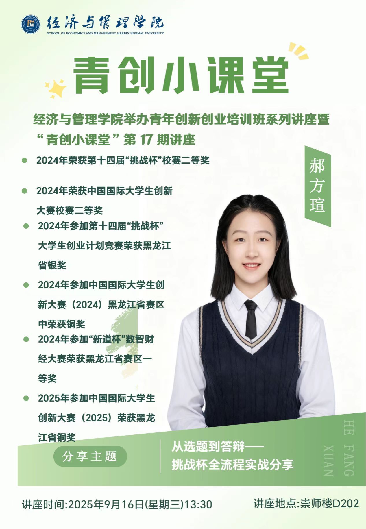 经济与管理学院创新创业协会于2025年9月16日在崇师楼D202举办“青创小课堂”第十七期讲座。本次邀请的主讲人是曾获得过多次创新创业大赛奖项的2024级文学院汉语言文学专业的郝方瑄,为大家带来挑战杯创新创业大赛分享会专题讲座。有关事宜如下: