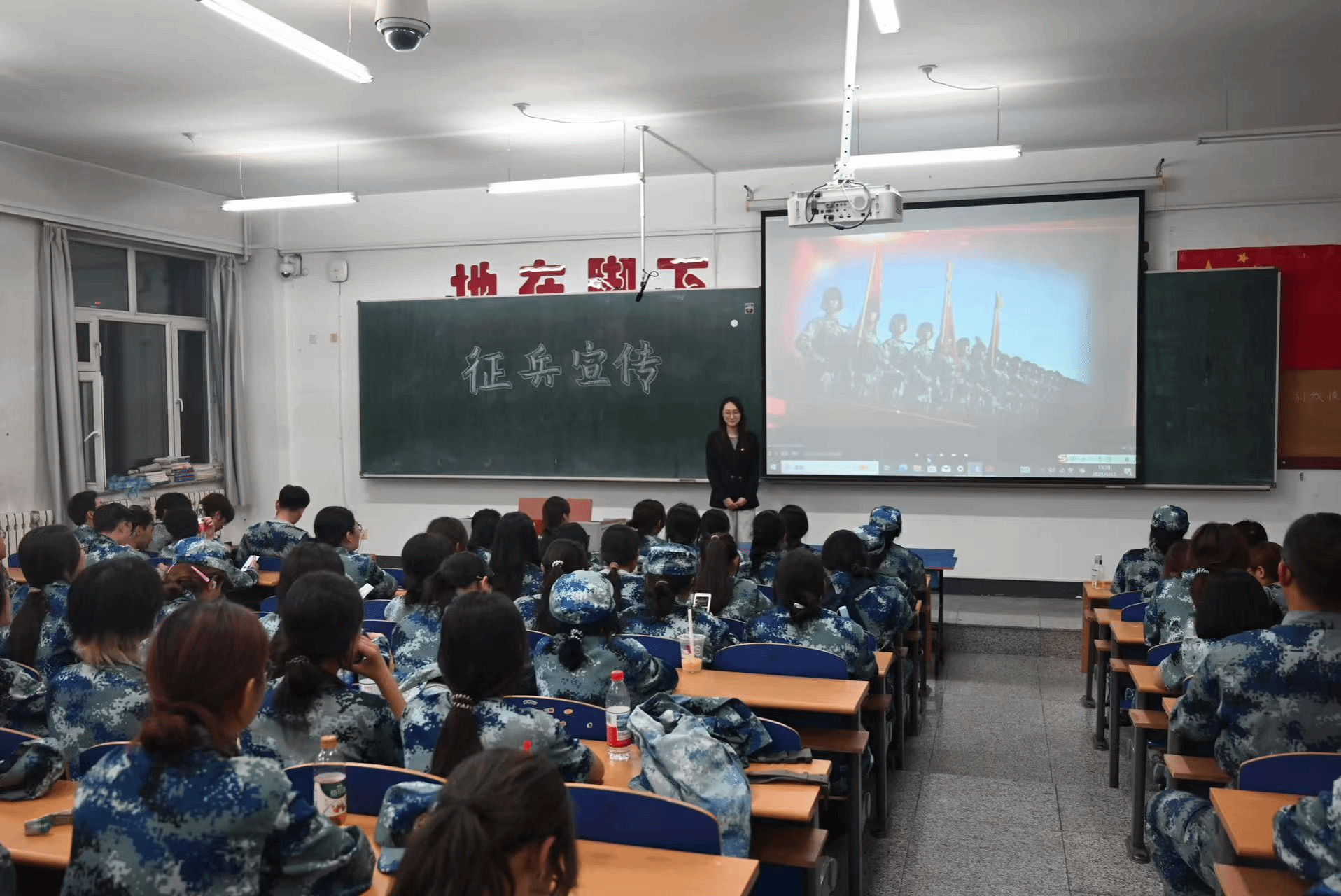 宣讲活动通过“政策解读+案例分享+观看影片”的形式,向新生系统讲解2024年征兵条件、报名流程、学历保留、学费减免、退役就业创业扶持等核心政策,重点解读大学生士兵在考学提干、专项招录等方面的优先权益。首先辅导员老师们以“国防建设重要性与大学生使命担当”为核心,明确国家征兵政策的申报条件、流程规范及优抚保障等核心内容,帮助新生全面掌握政策要点。同时聚焦本校退役学长的军营成长案例,通过分享其在部队的意志锤炼、能力提升历程,强调青年学子将个人理想融入国防事业的时代价值,引导新生深刻认识参军入伍对个人成长与国家发展的双重意义。最后新生们集体观看了征兵宣传片。片中展示的军营训练日常、官兵使命担当及学历优待、升学扶持等政策,让新生直观感受到军旅生活的热血与价值。