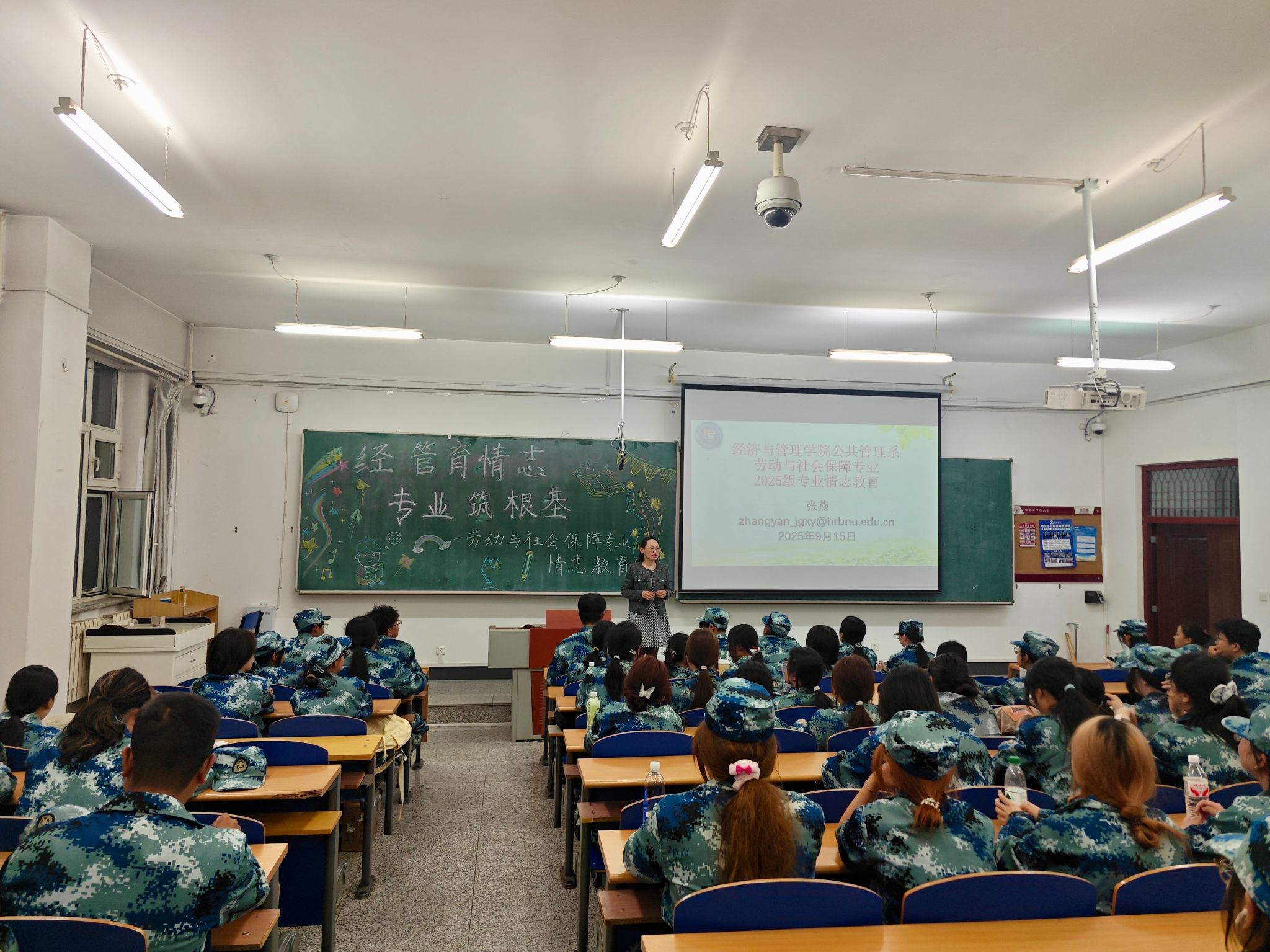 为深入落实学校大学生思想政治教育“112349”工作模式,扎实推进我院“十个一”新生入学教育方案,助力2025级劳动与社会保障专业新生认识专业、明确发展方向,经济与管理学院于9月15日18:30在崇师楼D203召开2025级劳动与社会保障专业新生专业情志教育大会。本次大会由劳动与社会保障专业负责人、教研室主任张燕老师主讲,2025级劳动与社会保障专业全体新生参加。