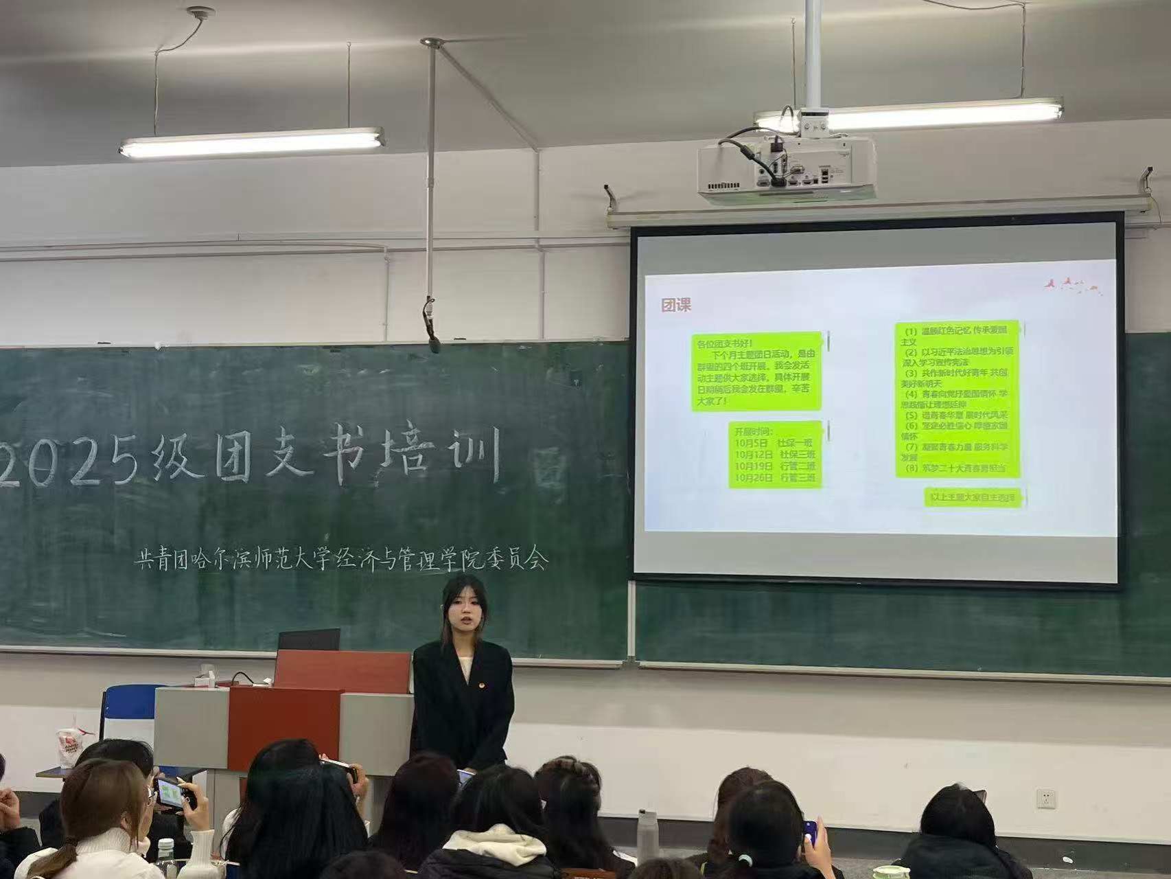 为进一步加强基层团组织建设,推动学院共青团组织各项工作的顺利开展。经济与管理学院于2025年10月27日18:30在崇师楼C202开展团支部书记培训大会,学院团委书记陈凤、28名团支书参加此次大会。