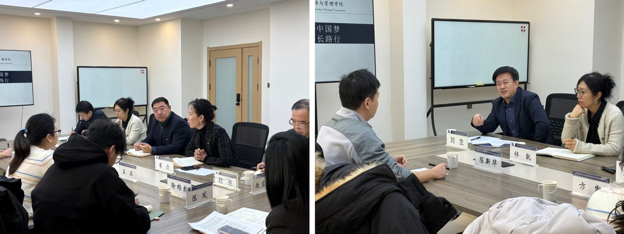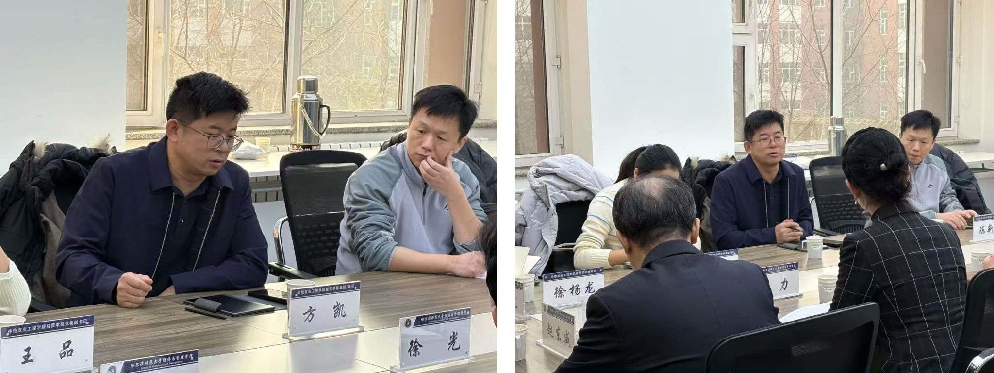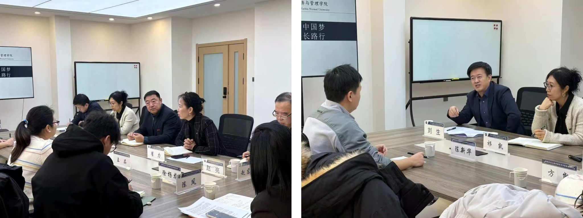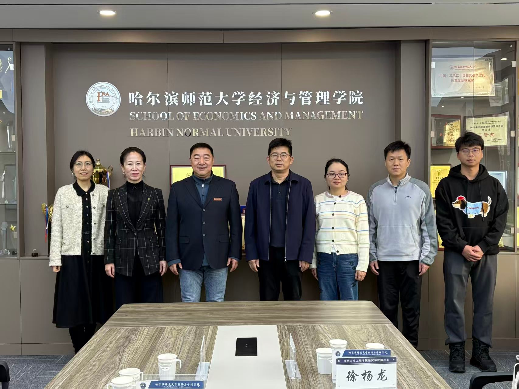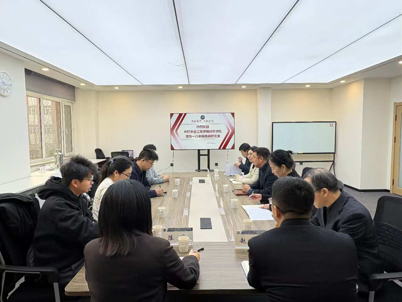 为深化学术交流合作,共促学科发展与学生培养质量提升,2025年11月26日上午8:45分,仲恺农业工程学院经贸学院院长方凯、党委副书记王品、团委副书记徐杨龙、投资系主任陈新华一行莅临哈尔滨师范大学经济与管理学院开展调研交流。经济与管理学院院长徐光、党委副书记翟力、副院长祁凯等领导热情接待并出席交流座谈会。