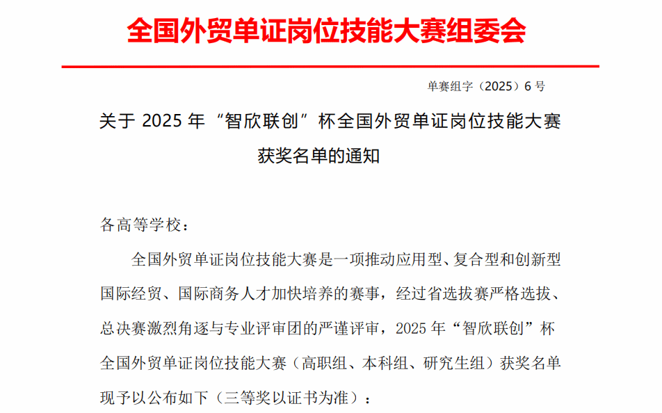 全国外贸单证岗位技能大赛聚焦于外贸业务实操,采用线上机考的团队协作模式,通过让学生在高度仿真的国际贸易业务场景中完成外贸单证业务,培养学生的实践操作能力与职业素养。整个竞赛过程不仅强化了学生对专业知识的综合应用,也锻炼了其细致严谨的工作态度和解决实际问题的能力,实现了“教、学、做、赛”一体化融合,为培养高素质外经贸技术技能人才提供了有力支撑。同时,获得大赛二等奖以上的学生还有机会获得《全国外贸单证员》岗位技能证书,这不仅是对学生能力的权威认证,也将为他们未来的职业发展和就业竞争力提供有力支持。