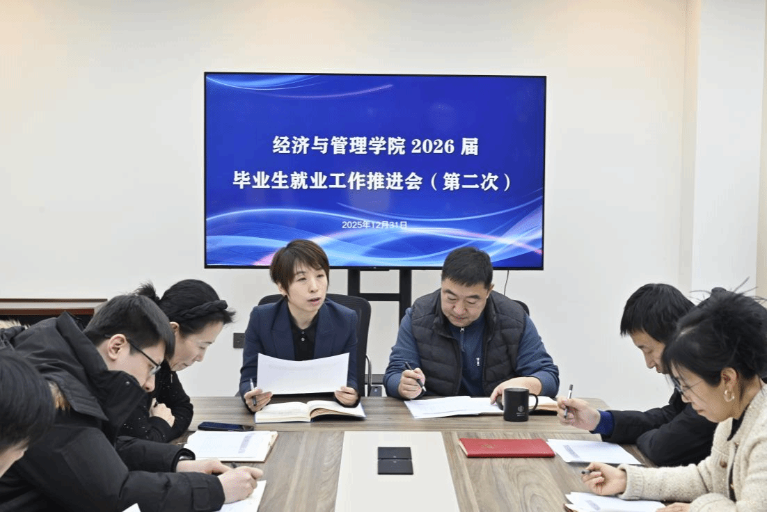 为深入贯彻落实学校关于就业工作的决策部署,全力推进2026届毕业生就业工作的提质增效,2025年12月31日下午,经济与管理学院在崇师楼A221会议室召开2026届毕业生就业工作第二次推进会(第二次)。学院领导班子成员、各系主任、毕业年级辅导员参加会议。会议由学院党委书记陈莹莹主持。