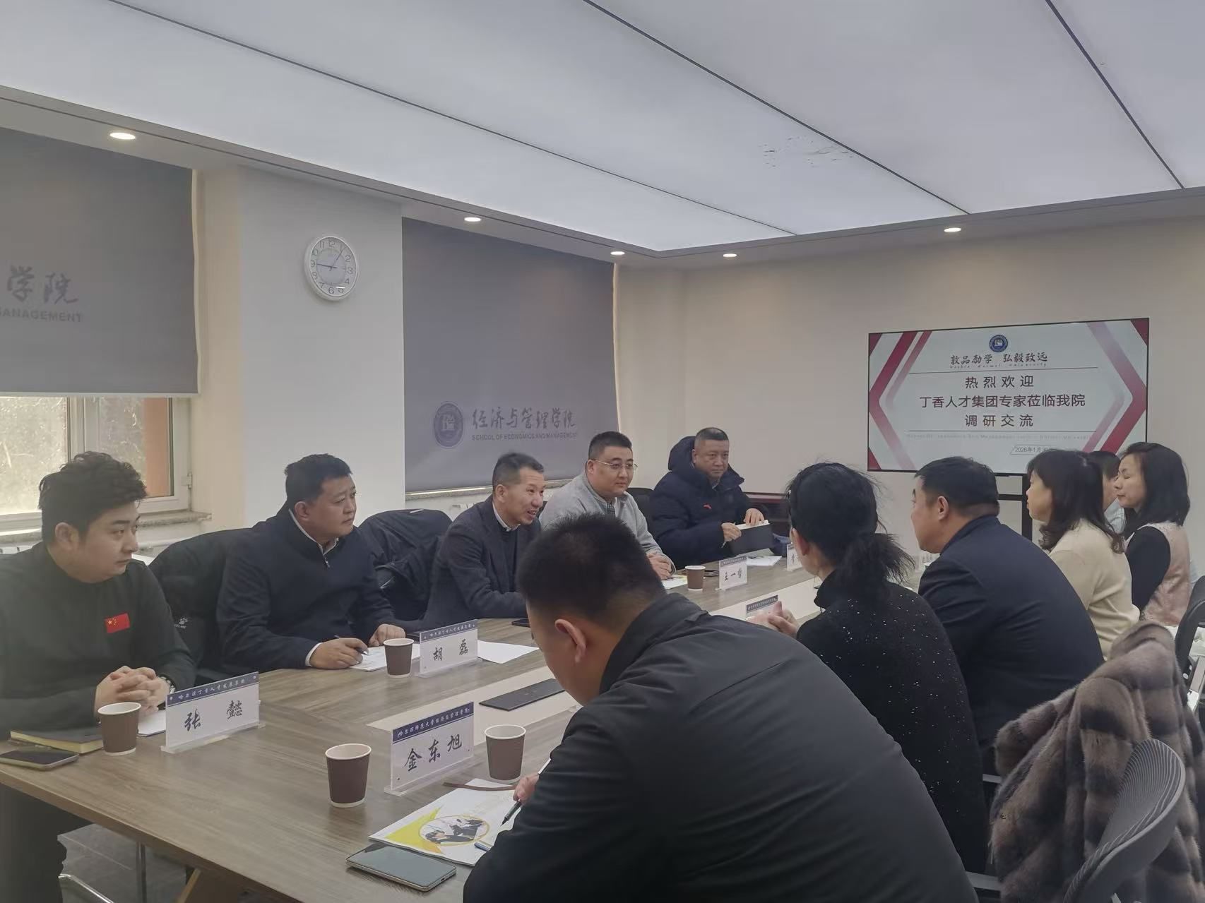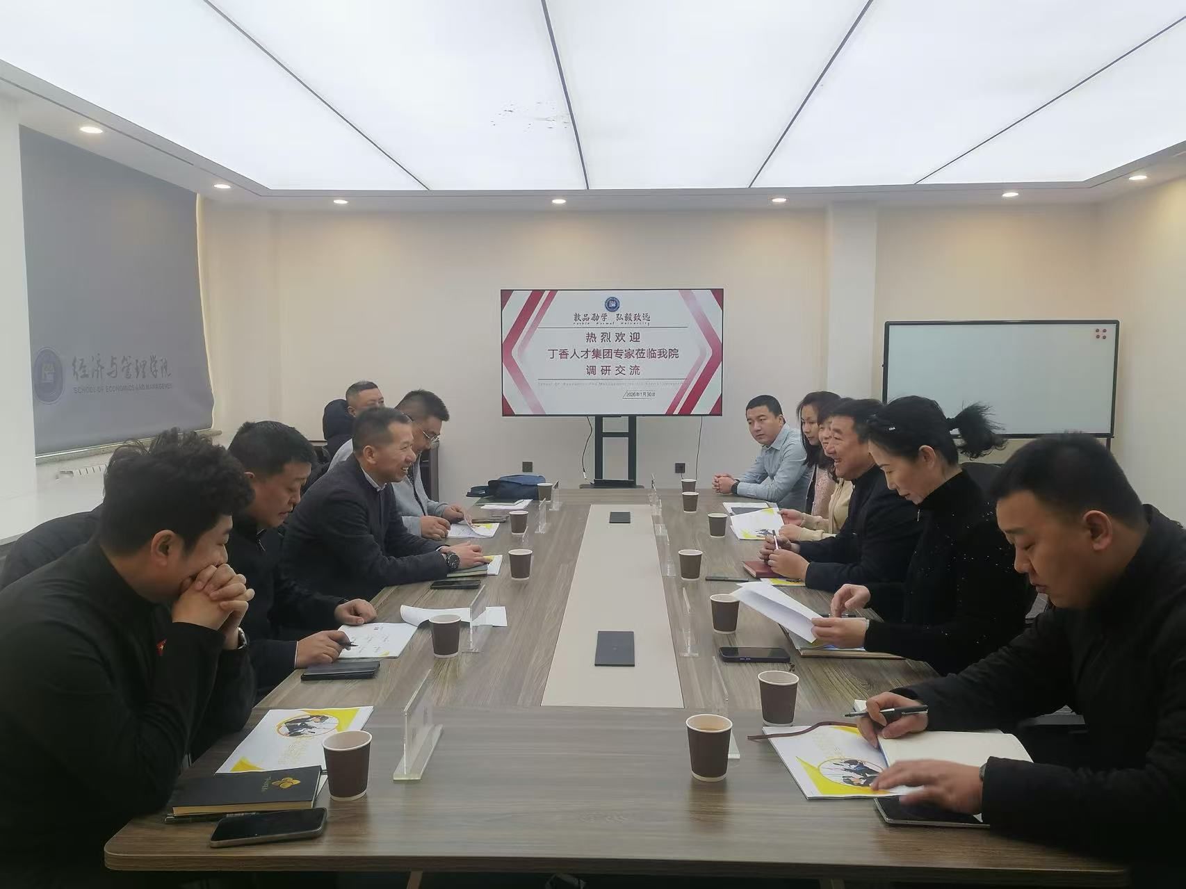 1月30日上午9时,经济与管理学院与哈尔滨丁香人才发展有限公司校企合作研讨会在崇师楼A221会议室举行。经济与管理学院院长徐光、学校就业处副处长王清艳、党委副书记翟力、副院长高阳;哈尔滨丁香人才发展集团总经理武书海、副总经理胡磊及双方相关部门负责人出席会议。