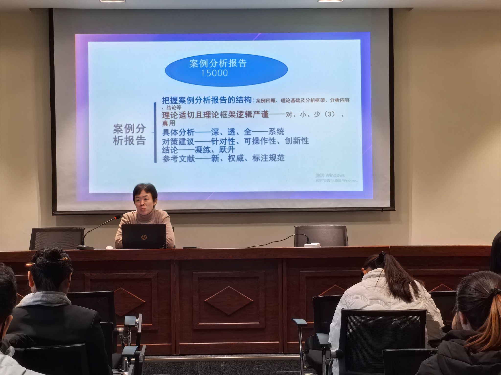 随后,刘岩芳教授就MPA研究生申请学位所要求的实践成果作了详细说明,强调成果须原创且基于真实情境。随后,她系统介绍了案例大赛的团队组建要求、案例选题规范、赛事流程及评审标准,并结合往届经验,对案例正文、分析报告与调研报告的撰写方法与结构要点进行了深入讲解。