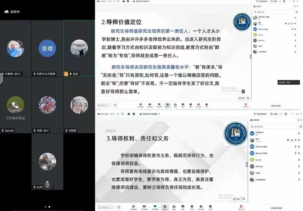 为深入贯彻落实《教育强国建设规划纲要(2024—2035年)》精神,全面提升研究生导师指导能力,强化“导师是研究生培养第一责任人”的使命意识,经济与管理学院于10月27日下午2:00在崇师楼A221举行研究生导师培训会,会议采取线上线下结合方式进行。本次培训会由经济与管理学院院长徐光教授主讲,学院新晋研究生导师参会,其中4位校内导师线下参会,6位校外导师线上参会。