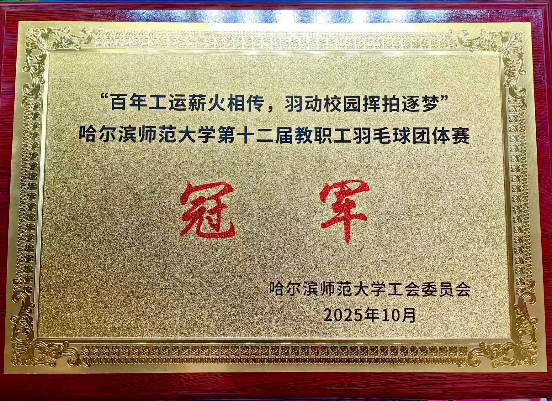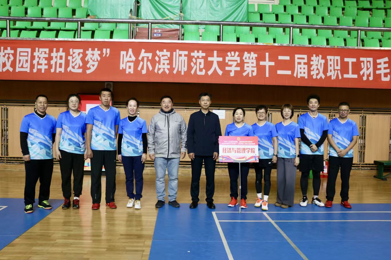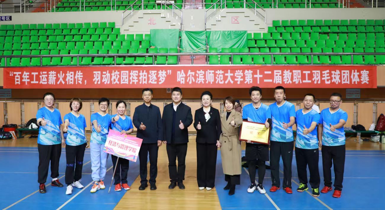 凯歌高奏,荣耀再续!2025年10月22日,哈尔滨师范大学“百年工运薪火相传,羽动校园挥拍逐梦”第十二届教职工羽毛球团体赛于松北校区体育馆拉开战幕。经济与管理学院教职工羽毛球队在本次比赛中凭借精湛技艺与顽强斗志,一路过关斩将,最终以无可争议的实力成功卫冕,再度将冠军荣誉收入囊中,续写了我院羽毛球赛事的辉煌篇章。